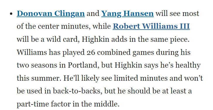 首先,是跟队采访开拓者多年的记者Sean Highkin在专栏报道中写道:“多诺万-克林根和杨瀚森将承担大部分中锋位置的出场时间,而罗伯特-威廉姆斯三世则是个未知数。威廉姆斯在波特兰的两个赛季总共只打了 26 场比赛,他今年夏天身体状况良好,但出场时间可能会受到限制,且不会出战背靠背比赛,但至少应该能在中锋位置上发挥一定作用。”