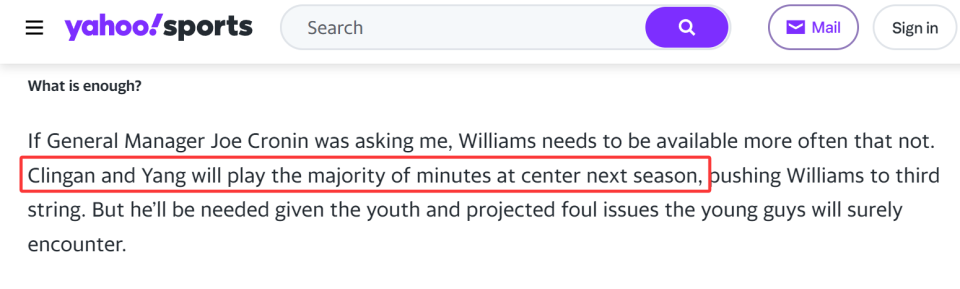 这并不是Highkin的一家之言,知名美媒雅虎体育也在今天报道开拓者的文章中明确指出:下赛季,克林根和杨瀚森将占据中锋位置的大部分时间,这会让威廉姆斯沦为第三选择。不过,雅虎体育也提了一句:考虑到这两位年轻球员可能会遇到犯规麻烦,球队仍会需要罗威。